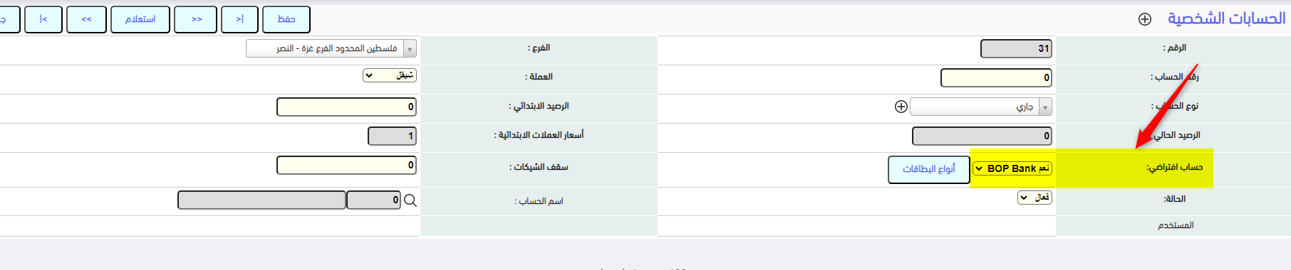 قم بتعريف حساب بنك فلسطين كحساب افتراضي : نعم BOB BANK كما هو موضح في الصورة التالية والهدف من ذلك ان تتحول الحركات الخاصه بفيزا بنك فلسطين الى هذا الحساب البنكي :