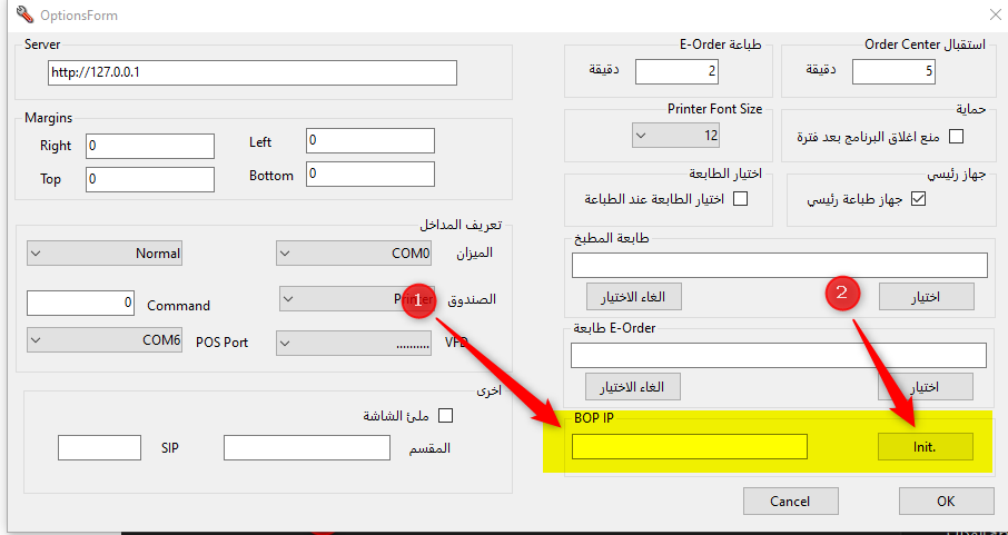 BOB IP كما هو ظاهر في رقم 1 في الصورة ثم اضغط على زر int. لانشاء اتصال بين البرنامج وماكنة الفيزا كما هو ظاهر في رقم 2 في الصورة المرفقه ادناه